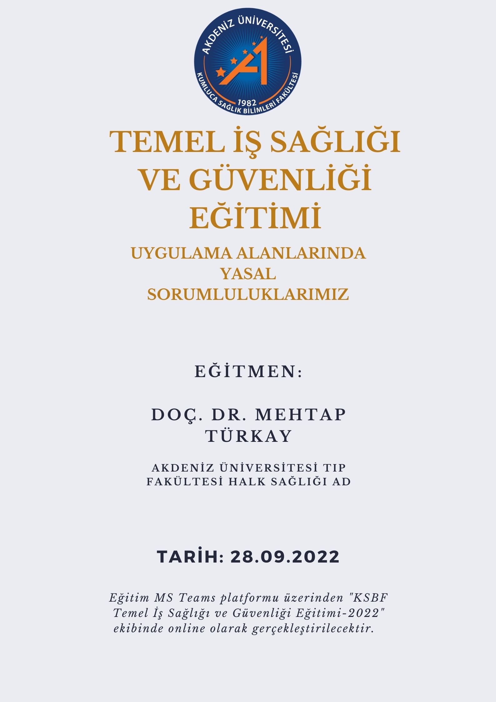 - Fakültemiz Hemşirelik Bölümü 1, 2, 3 ve 4. sınıf öğrencileri ile ve Çocuk Gelişimi Bölümü 2, 3 ve 4. sınıf öğrencileri için 28.09.2022 tarihli Temel İş Sağlığı ve Güvenliği Eğitimi Afişi